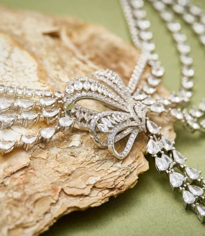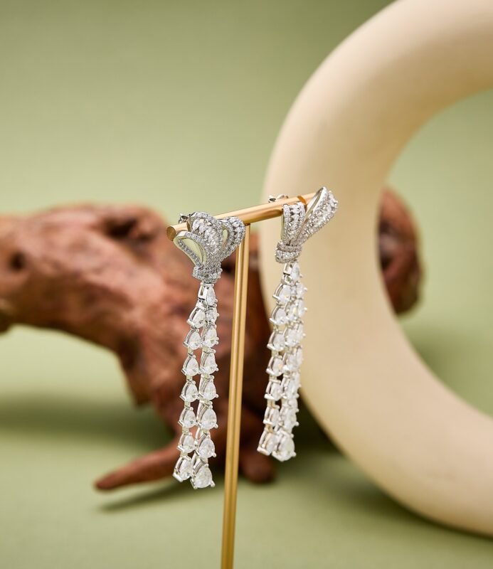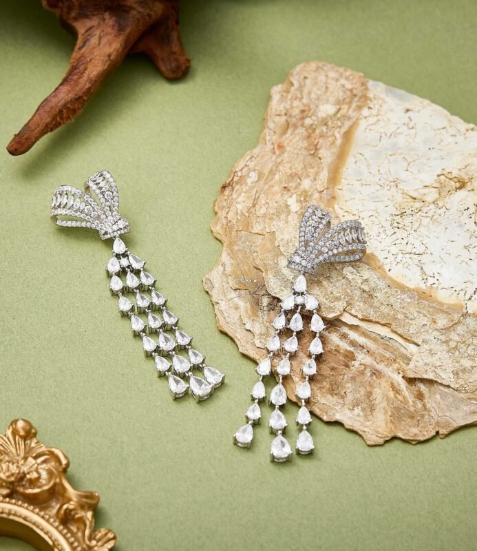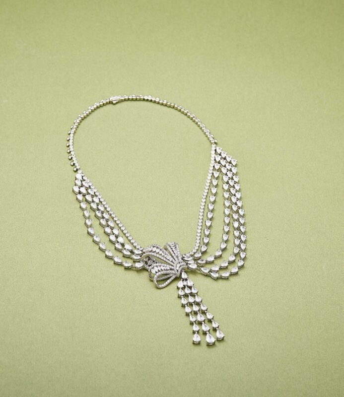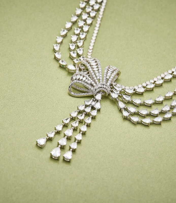 The ‘Bow Tassel Evening Necklace’ dazzles like a work of art. The zircon-studded bow spreads like delicate fairy wings, while the tassels shimmer like starlight in motion. Layered chains weave a sparkling galaxy, each detail narrating the romance of ‘butterflies dancing as light cascades.’ Plated in white gold, wearing it feels like capturing the romance of a French palace around your neck. Perfect for everyday wear or pairing with evening gowns, this piece exudes sweet elegance and sophisticated luxury.