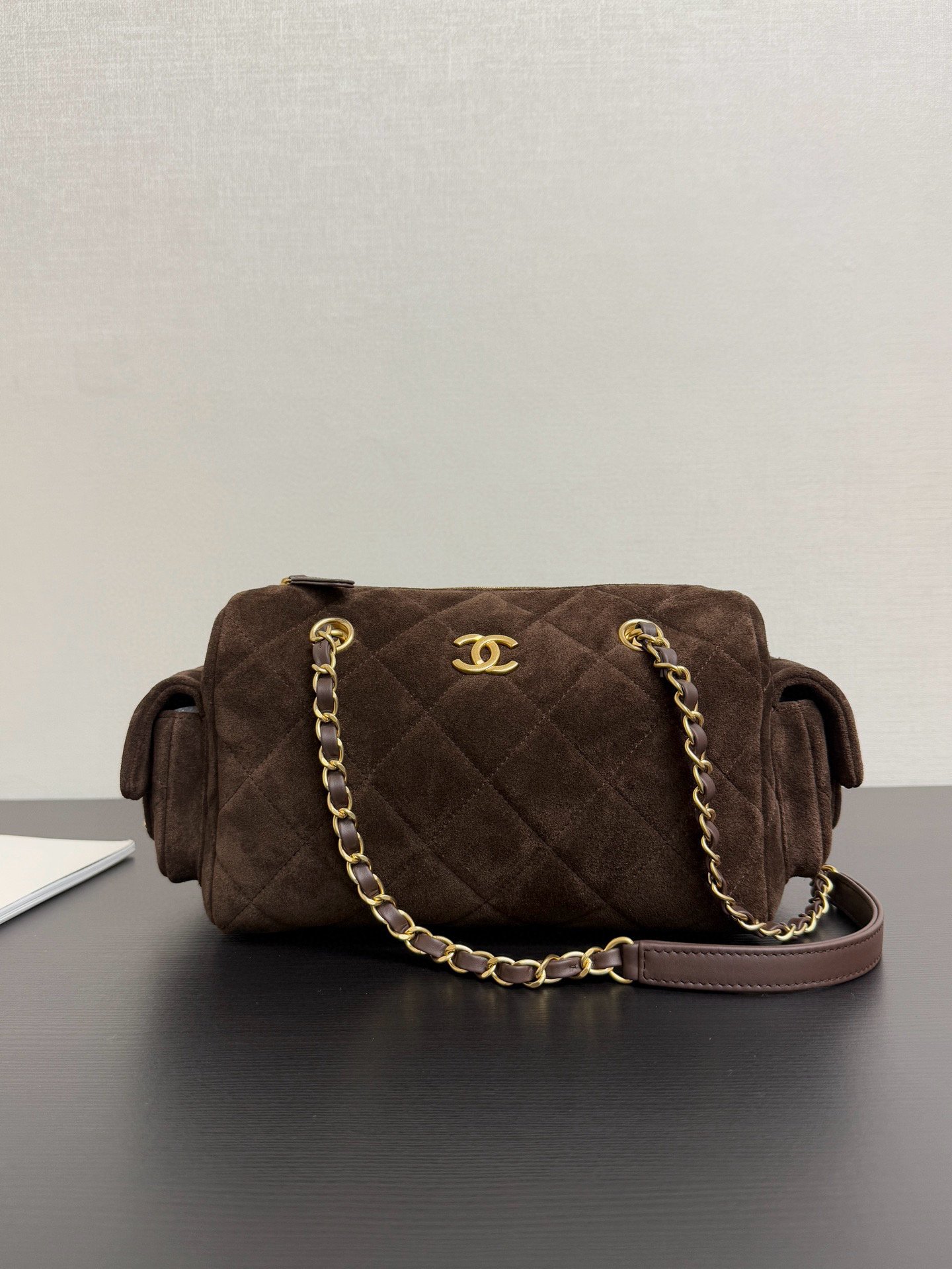 The diamond-quilted vintage style is fully on point, with gold buckle and chain details adding a perfect touch . The two side pockets are highly practical, ideal for storing headphones or car keys. Worn over the shoulder, it feels effortless yet sophisticated — a quality statement piece for autumn and winter outfits. Size: 15.5 × 24 × 11.5 cm.