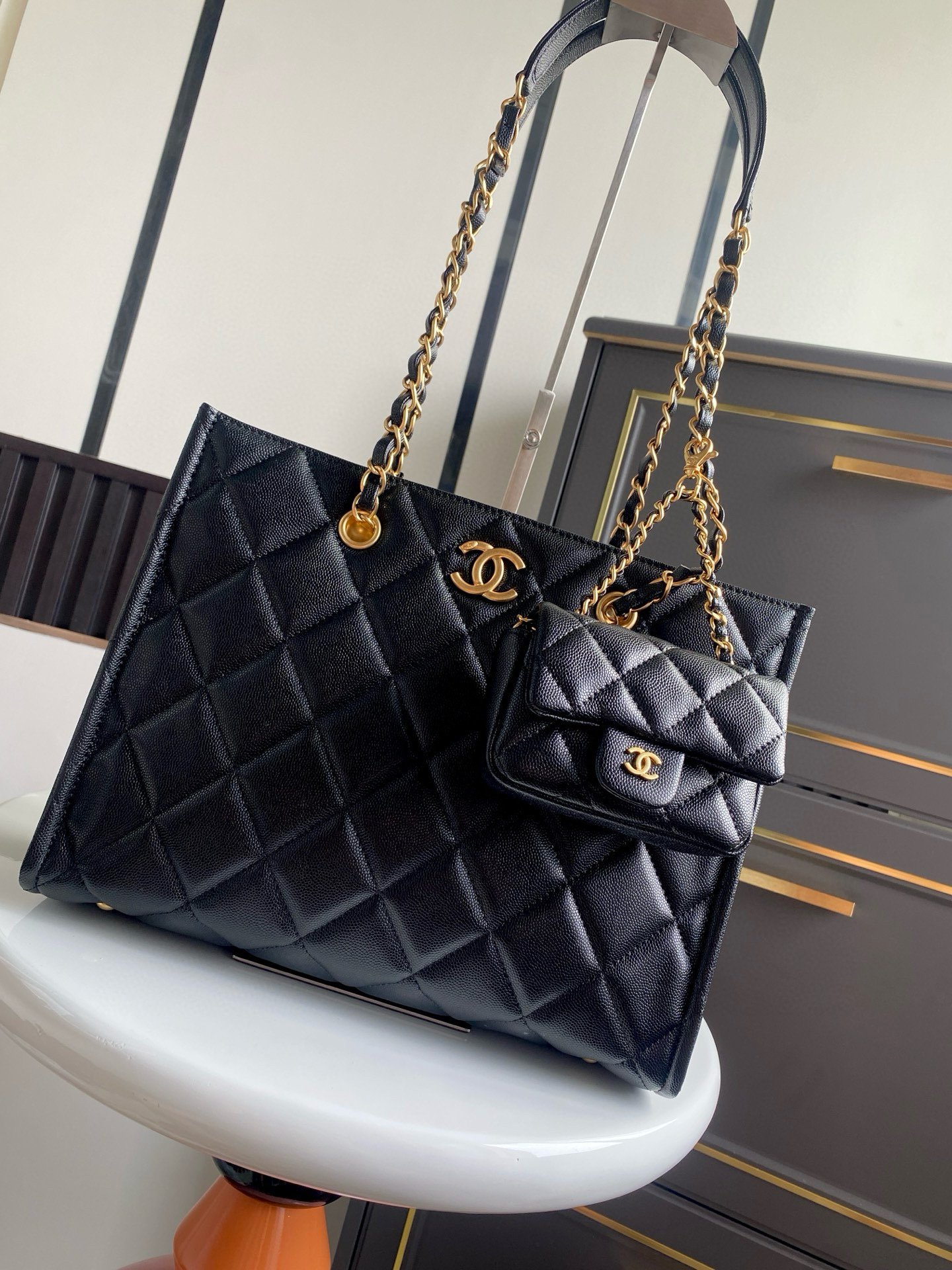 This season’s must-have piece with generous capacity. Features the classic chain design paired with pebbled calfskin — durable and long-lasting. The chain also includes a small pouch, adding an extra touch of elegance.