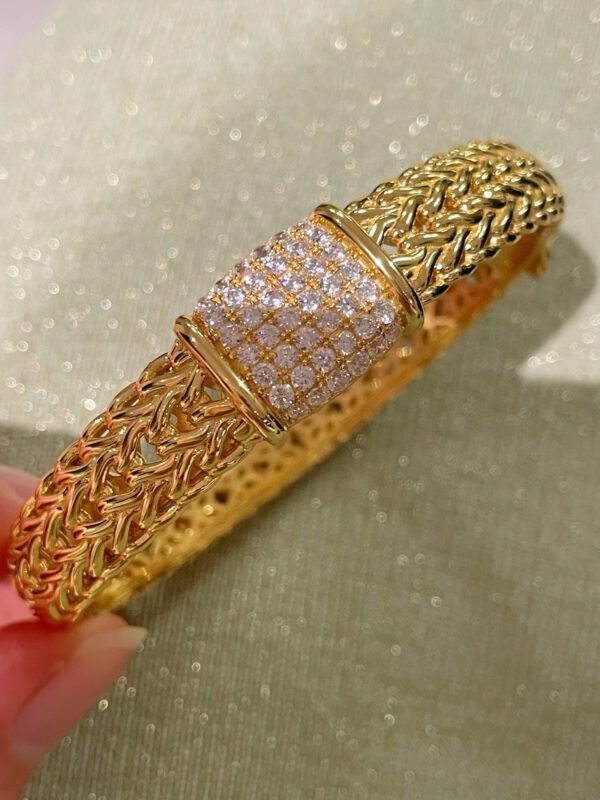 Crafted entirely from S925 sterling silver with 18K gold plating, featuring full pavé stones and a hand-woven rattan pattern.