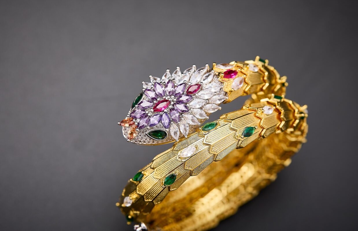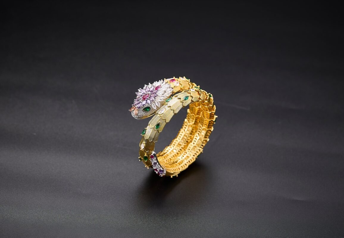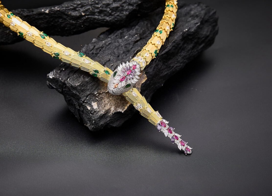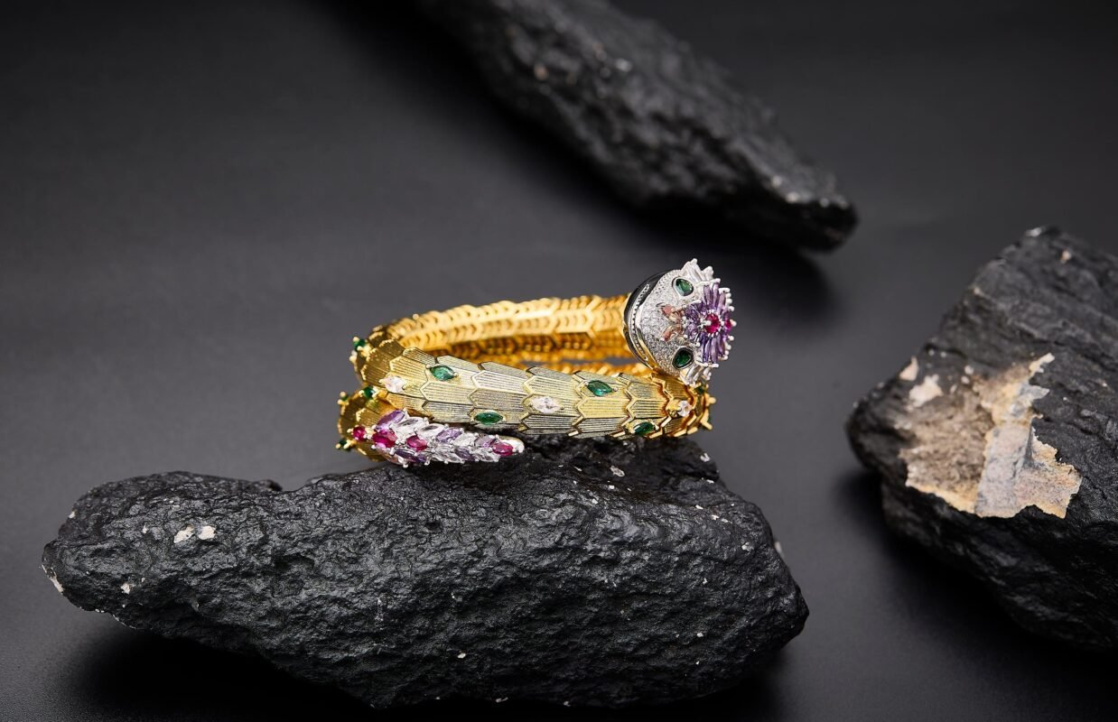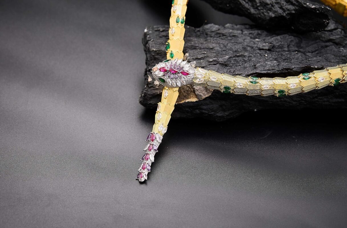 Crafted in gold, the snake’s body forms a fluid, lifelike curve, with each scale seemingly breathing. The eyes, set with rubies and diamonds, shine with an alluring glow in the dark; emerald accents evoke the natural vitality a snake absorbs while gliding through the jungle. The gradient-colored gemstones at the tail provide the finishing touch, enhanced by multi-tone plating.