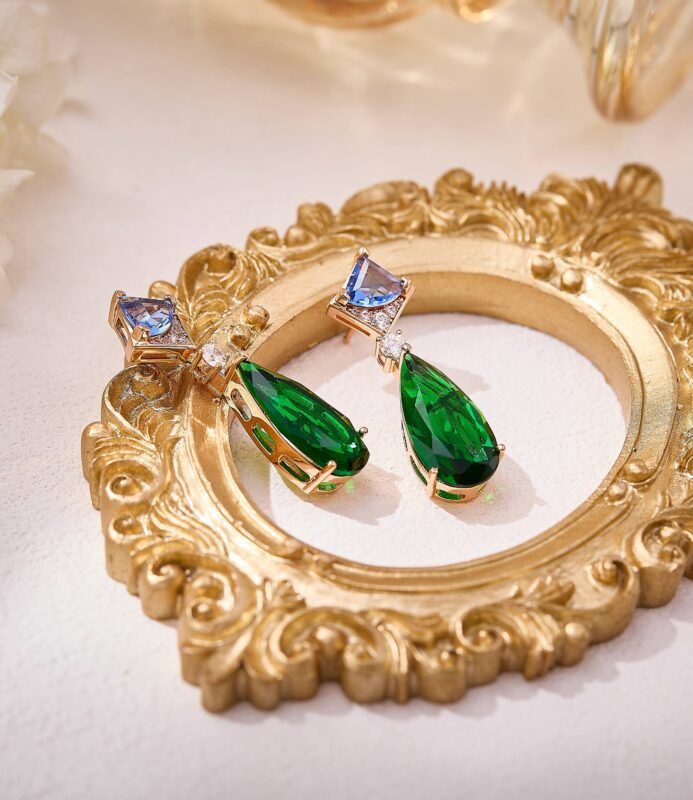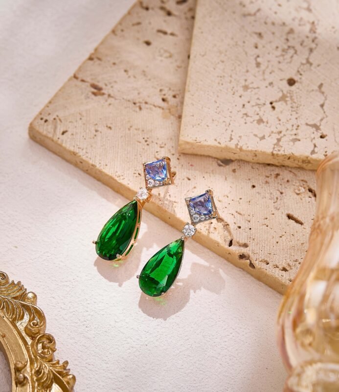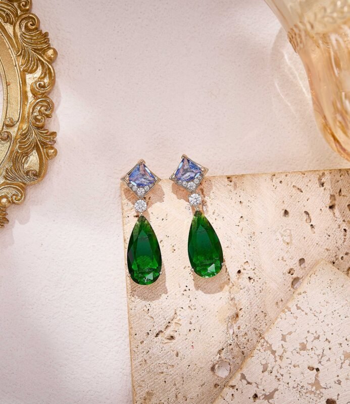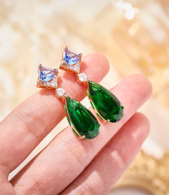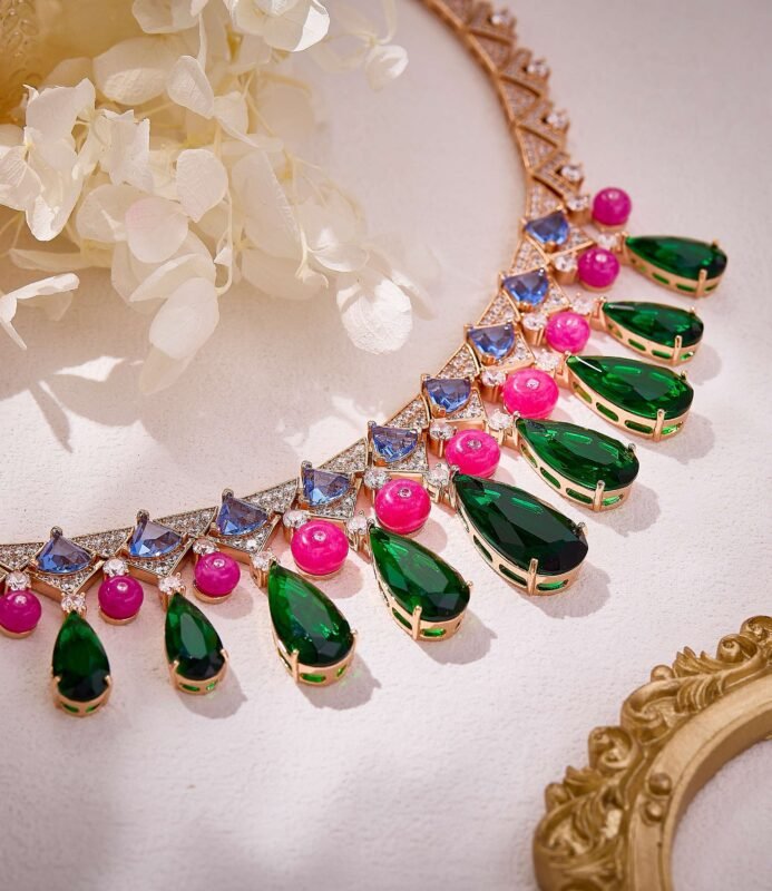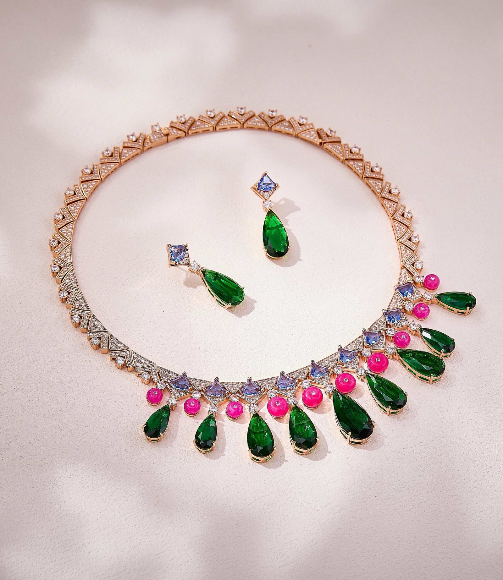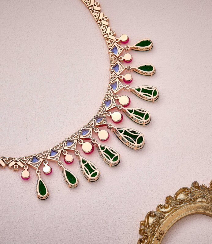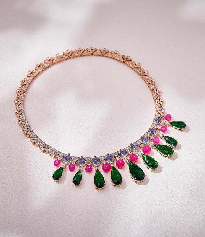 Geometric gold chains exude effortless style, featuring teardrop green gemstones, smooth pink beads, and triangular multicolor gems. The collision of different shapes creates a striking statement — wear it and instantly slay the scene Plated in white gold.
