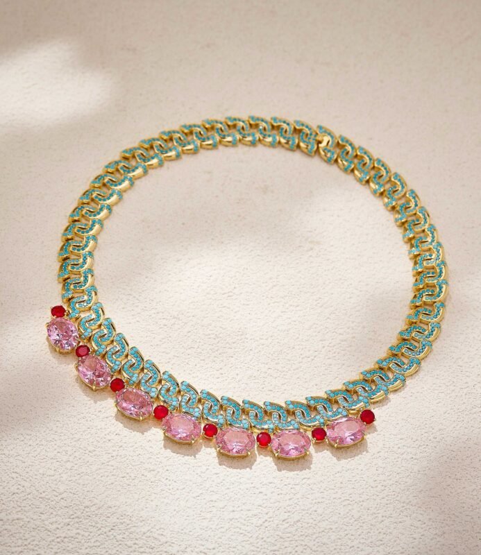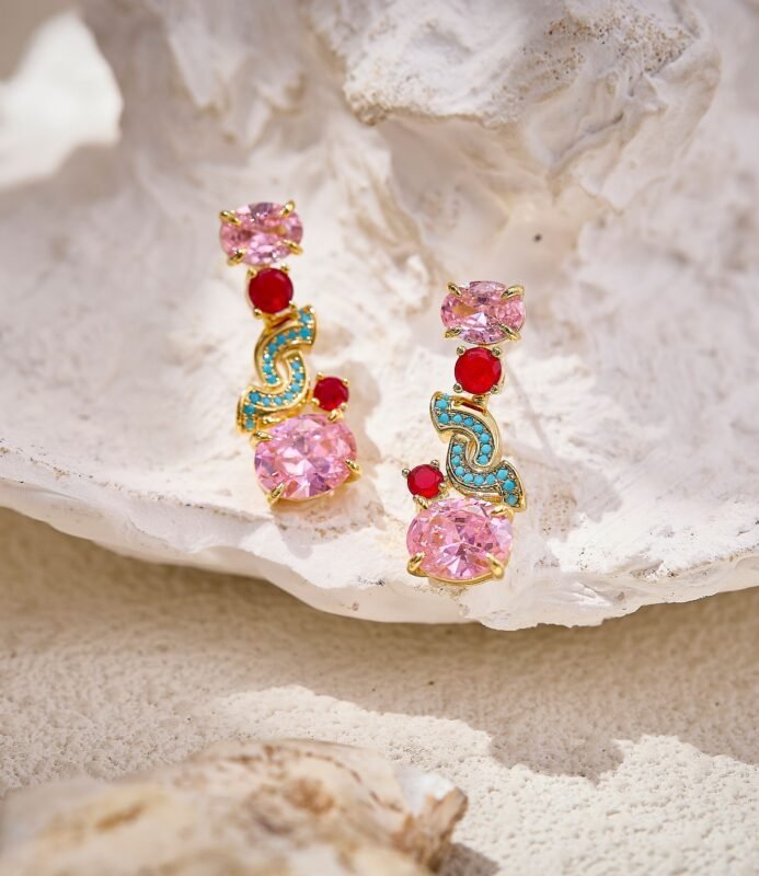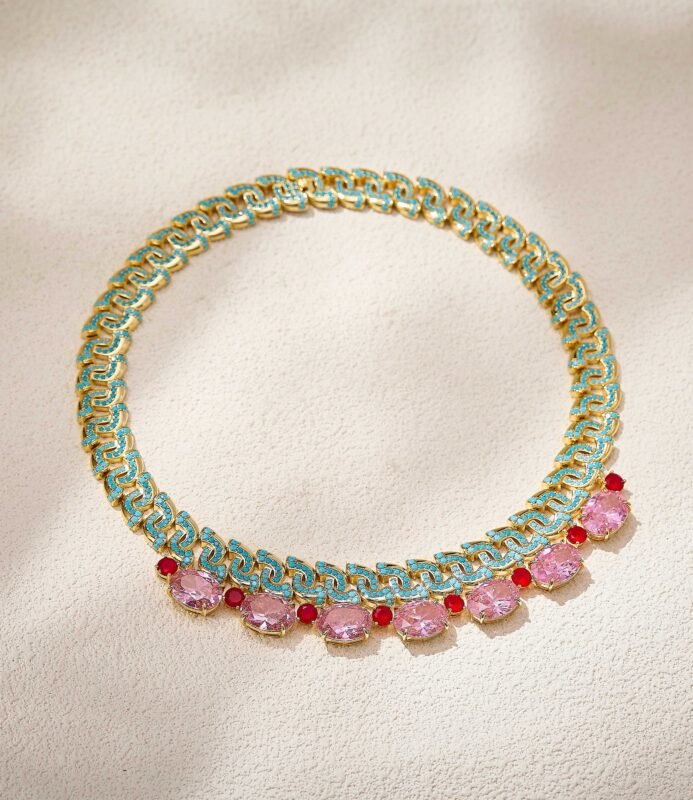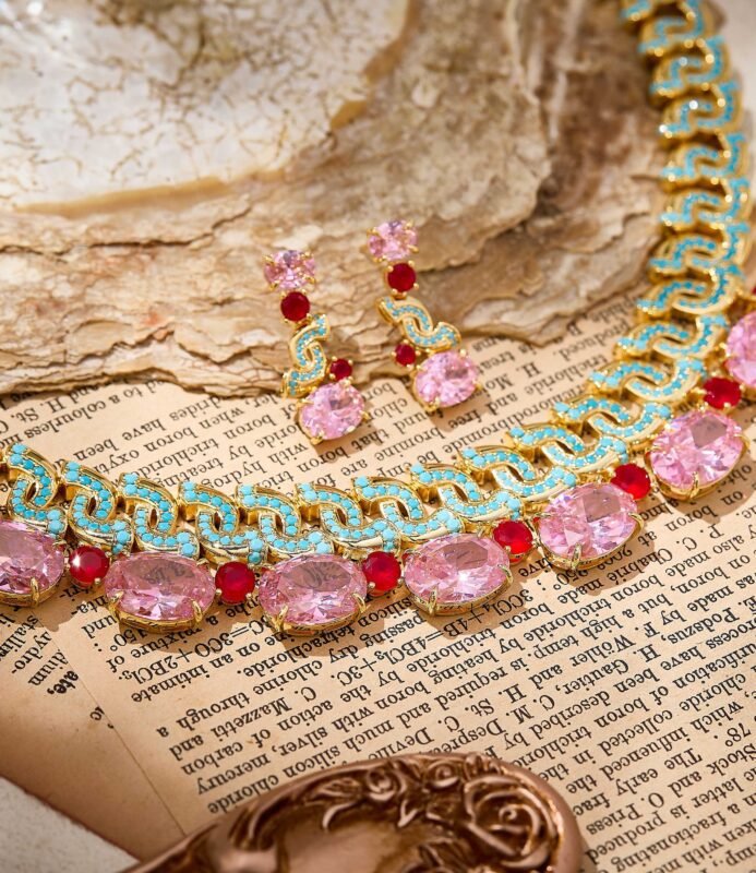 This ‘S-Shaped Pink Evening Necklace’ completely stole my aesthetic! The gold chain weaves into a fluid S-curve, while pink stones clash with emeralds to create a playful yet edgy spark. Sparkling zircon accents shimmer throughout. Wearing it feels like capturing all the spotlight and sophistication of an evening gala around your neck. Who could resist this sweet-yet-bold design exuding luxurious romance? ✨ Available in white gold plating, yellow gold, and champagne gold.