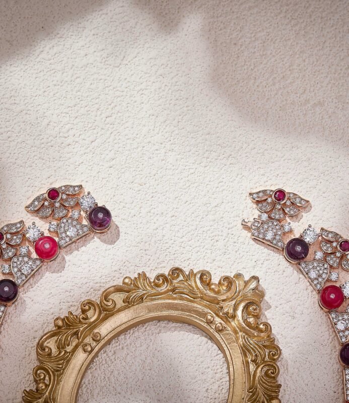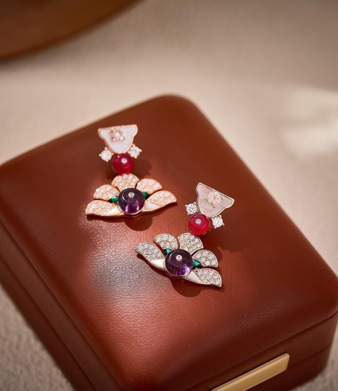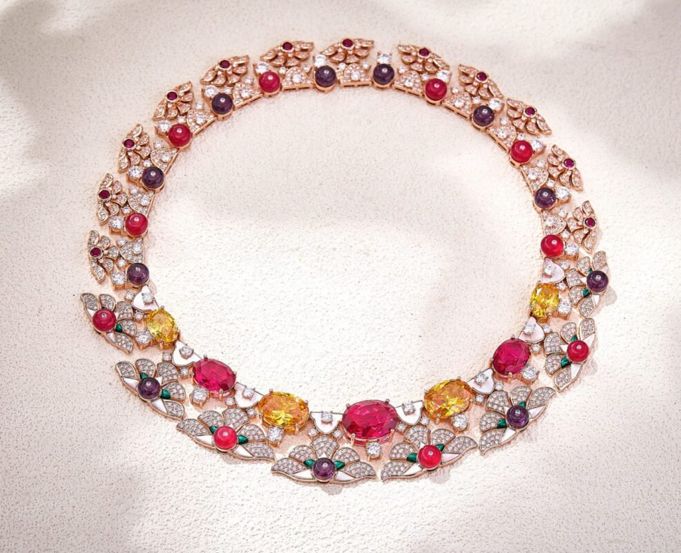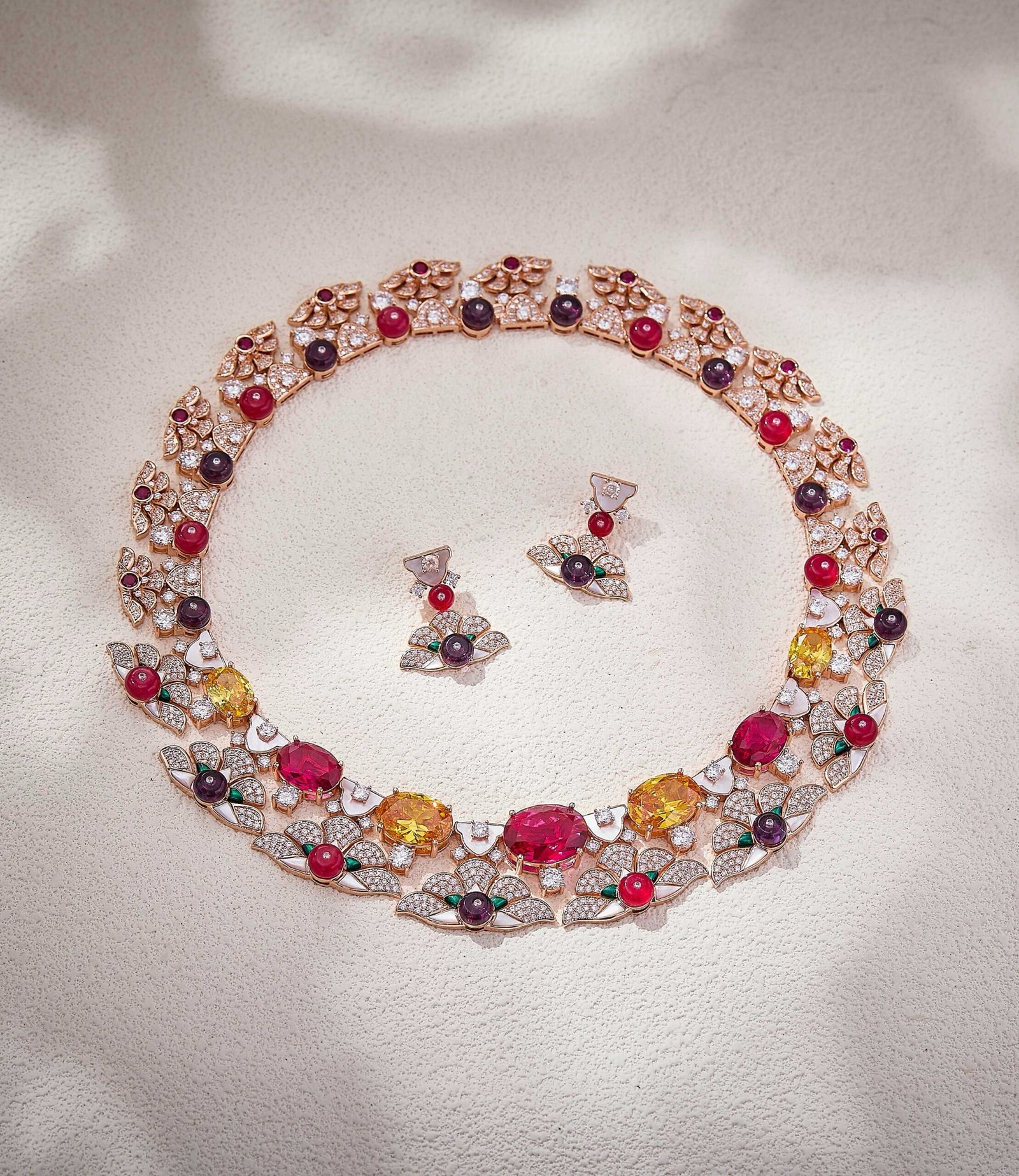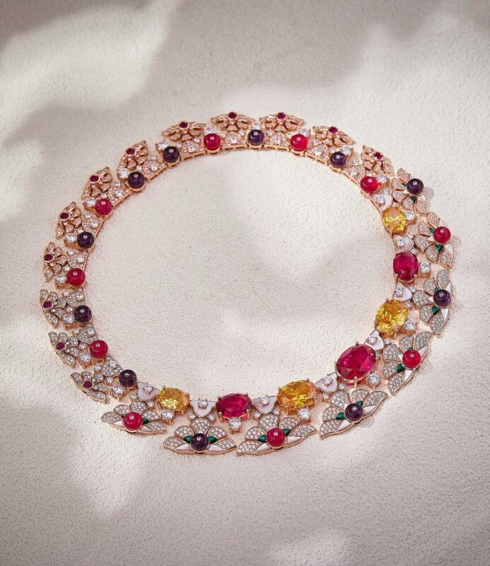 Wearing this necklace feels like draping a blooming garden around your neck. The floral design is vivid and full of life—each gemstone glistens like dewdrops on petals, shimmering under the light. Fiery reds, radiant yellows, and mysterious purples intertwine with delicate stones, where every curve whispers elegance and every hue paints a touch of romance. Within this exquisite silhouette, I encounter my own moment of timeless grace.